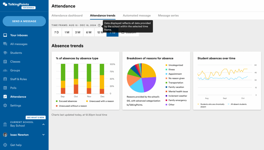 TalkingPoints’ Attendance Dashboard & Attendance Trends surfaces these patterns early, flagging students at risk of chronic absence and equipping staff to respond before issues escalate.