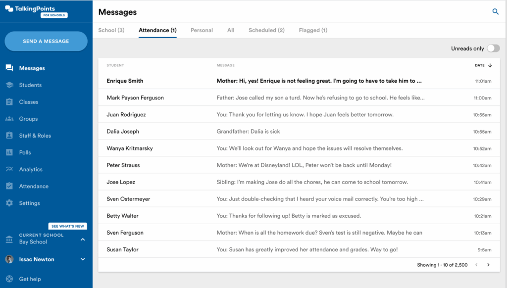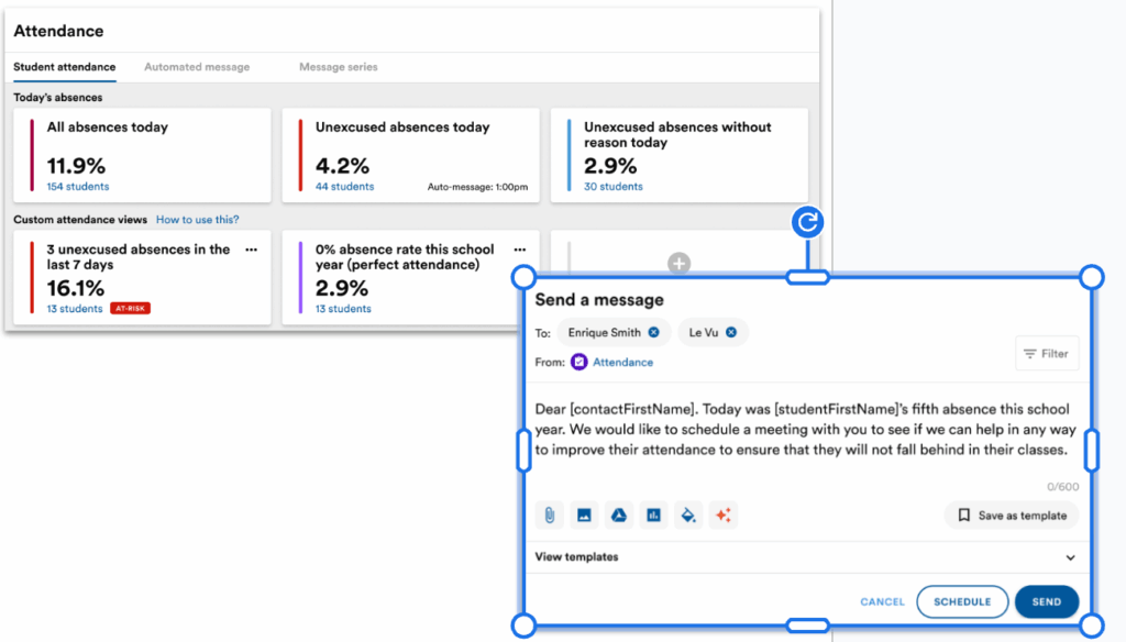 TalkingPoints supports this with tools like Targeted Attendance Messages that identify and reach families with specific attendance patterns, and an Attendance Messaging Series, which offers research-based, weekly texts that teach families about the importance of attendance and provide practical tips for improvement.