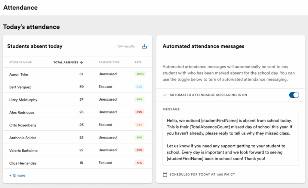 For staff, a centralized Attendance Inbox keeps all communication organized and translated, while Automated Daily Absence Messages notify families when a student misses school. Personalized outreach guided by data helps teams save time, reduce phone tag, and build trust.