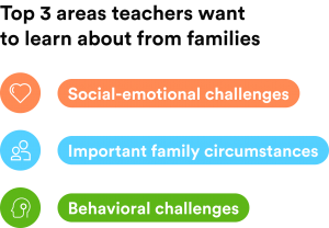 One finding from the research was that teachers wanted more insight into student home life and any circumstances that could impact classroom behavior and learning. The top three areas teachers wanted to learn more about from families were social-emotional challenges, important family circumstances, and behavioral challenges.