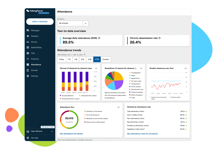 - Attendance trends helps you track chronic absenteeism, compare patterns across schools, and understand the reasons behind absences to better align interventions